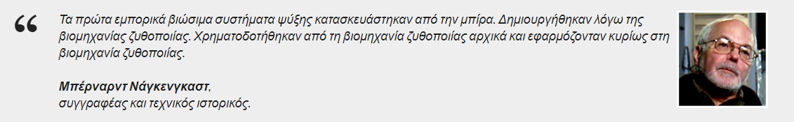 Η μπίρα όμως, έβλεπε στο μέλλον. Οι ζυθοποιοί ενδιαφέρονταν πολύ για τις προόδους τεχνητής ψύξης. Πολλοί τους θεωρούσαν τρελούς. Έριξαν όμως χρήματα στην έρευνα. Το πρώτο εμπορικό ψυγείο στον κόσμο ήταν ένα τεράστιο μηχάνημα. Το ψυγείο αμμωνίας. Εφεύρεση του Καρλ φον Λίντε το 1881 για χάρη της μπίρας. Η ψύξη για τους ζυθοποιούς ήταν η κότα με τα χρυσά αυγά. Αν έχεις ψύξη, μπορείς να φτιάχνεις μπίρα όλο το χρόνο. Έφερε εκατομμύρια στη βιομηχανία παραγωγής μπίρας. Μας έδωσε μια συνεχή ροή παγωμένης lager κι άλλαξε τον κόσμο για πάντα. Η ψύξη έλυσε ένα από τα μεγαλύτερα προβλήματα της ανθρωπότητας, την αποθήκευση τροφής. Η βιομηχανία της μπίρας έδωσε αυτή τη δυνατότητα σε δισεκατομμύρια ανθρώπους. Πάλι η μπίρα. Πάλι έσωσε ζωές! Ψύξη σημαίνει κλιματισμό. Κατασκευή και αποθήκευση φαρμάκων. Δυνατότητα να μένουν ζωντανά τα όργανα για μεταμοσχεύσεις. Είναι τόσα πολλά και διαφορετικά τα πράγματα που κάνει. Θα δυσκολευόμασταν πολύ να επιβιώσουμε χωρίς αυτήν σήμερα. Και, απλώς σκεφτείτε το. Όλα αυτά χάρη στην μπίρα.